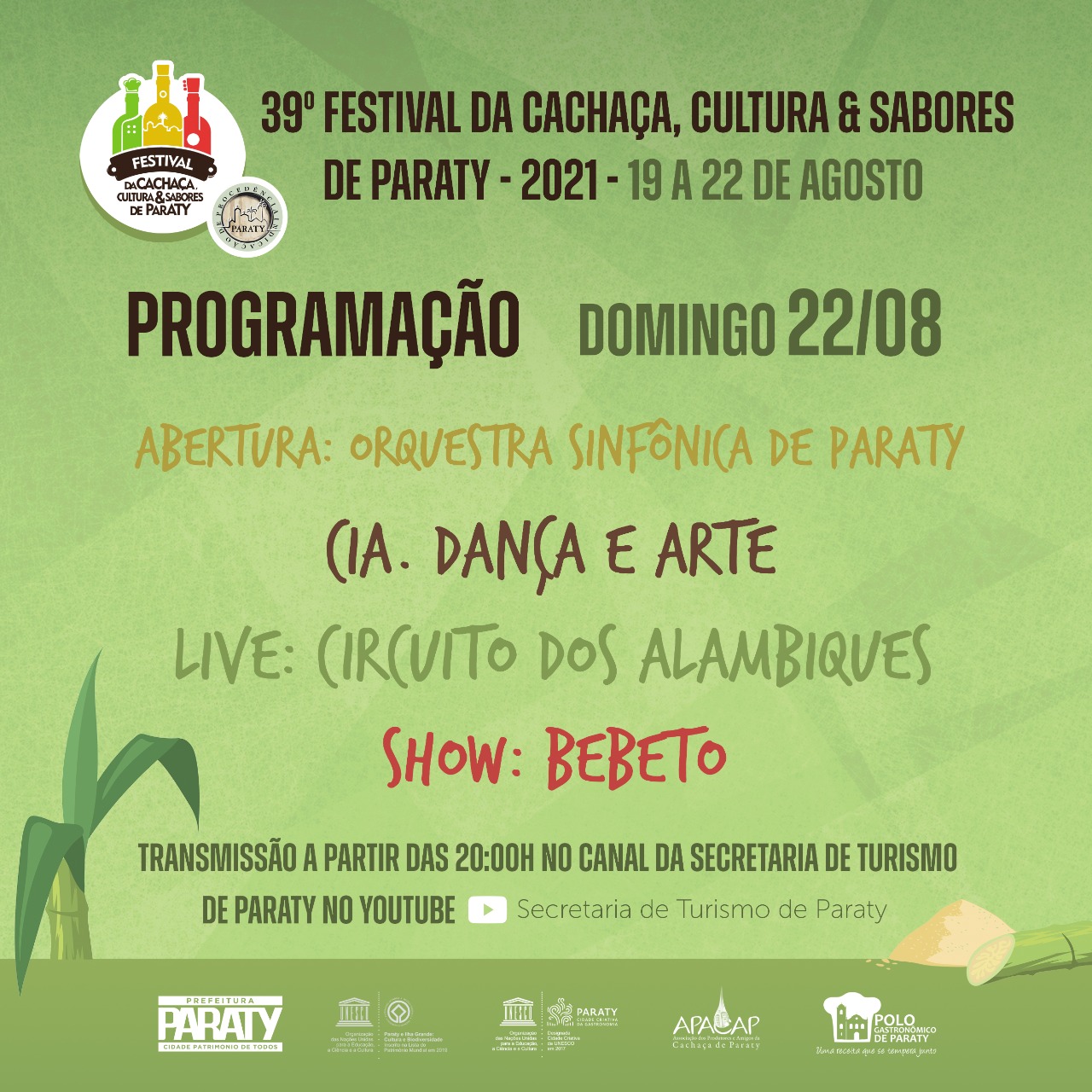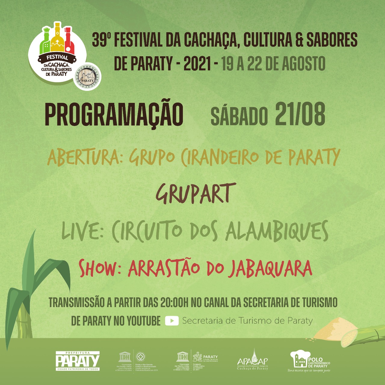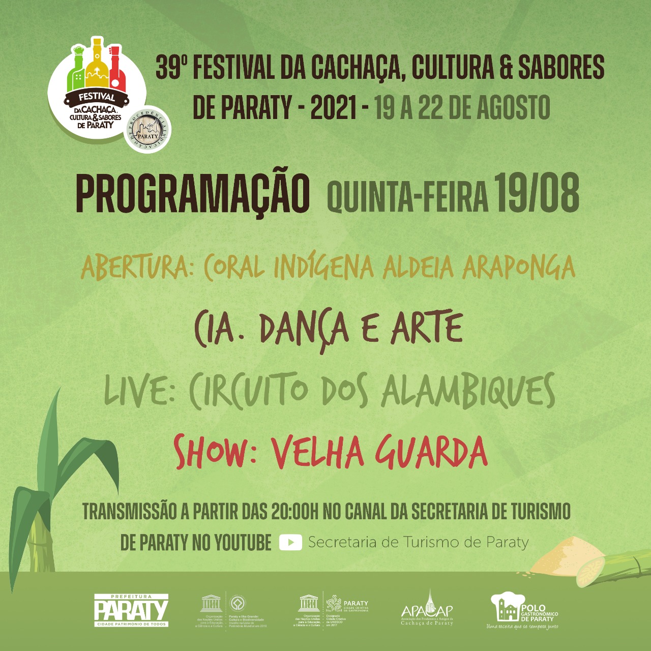 Este novo formato inclui o Circuito de Visitação dos Alambiques, onde o público poderá conhecer o processo de fabricação da cachaça produzida em cada alambique, contada por seus produtores, além de uma extensa programação cultural, com apresentações de danças, teatro e muita música boa, com atrações que prometem animar o público ligado na web. Prepare a sua cachaça e venha curtir com a gente!