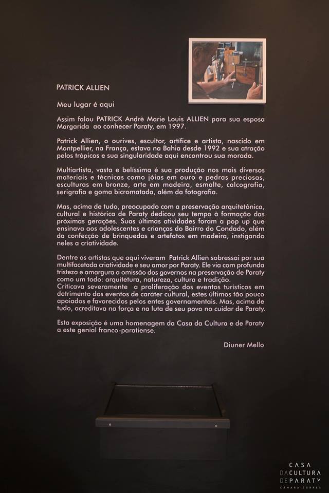 Patrick Allien, o ourives, escultor, artífice e artista, nascido em Montpellier, na França, estava na Bahia desde 1992 e sua atração pelos trópicos e sua singularidade aqui encontrou sua morada.