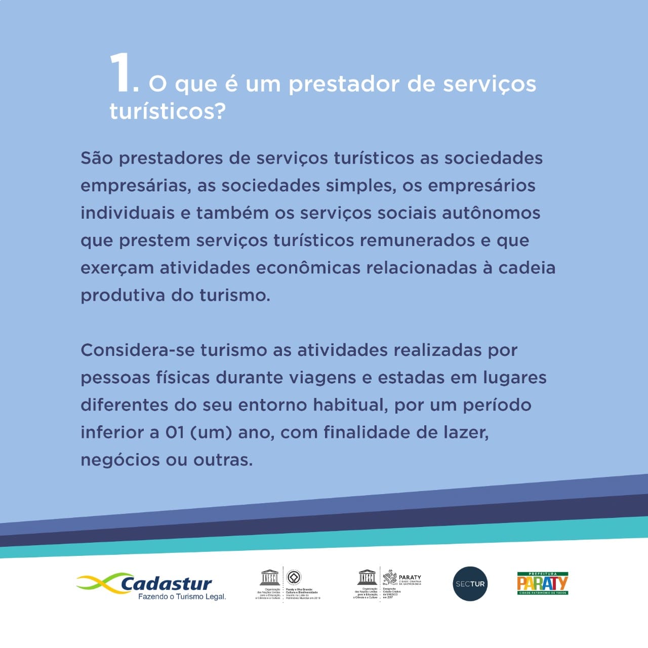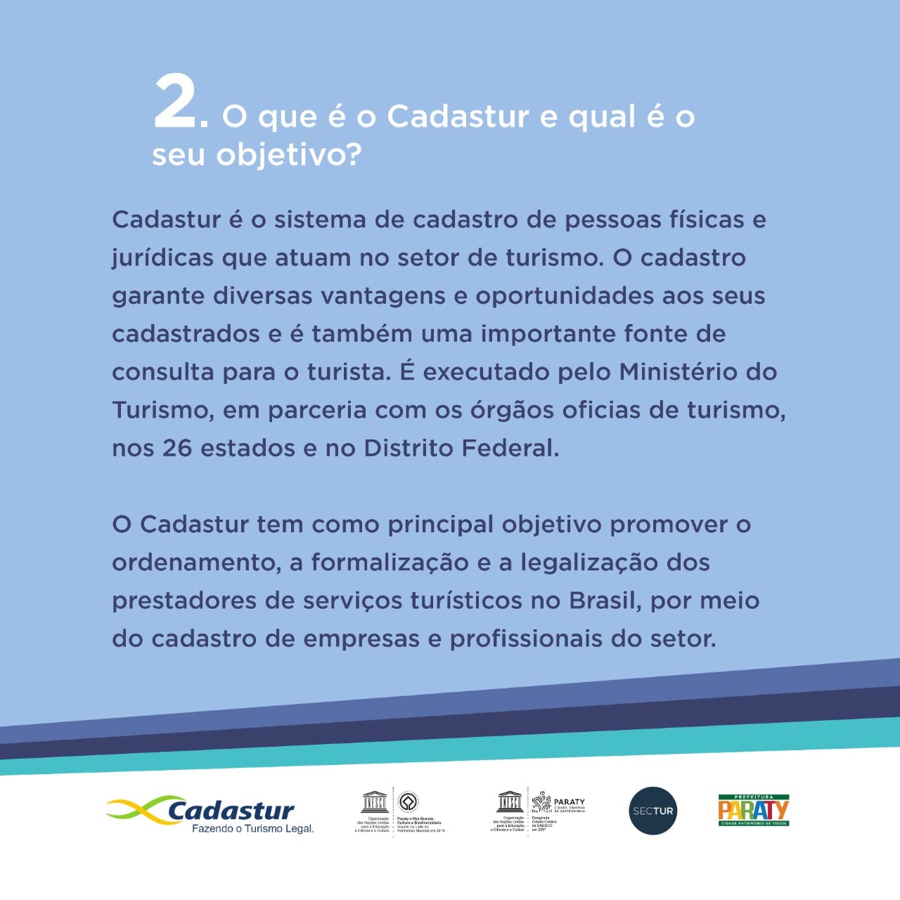 O Cadastur é o sistema de cadastro de pessoas físicas e pessoas jurídicas que atuam no setor do turismo. De acordo com a lei nº 11.771, de 2008, o Cadastur é obrigatório para campings, agências de turismo, meios de hospedagem, organizadores de eventos, parques temáticos e transportadoras turísticas. O Cadastur também é obrigatório para os guias de turismo, conforme a lei nº 8.623, de 1993.