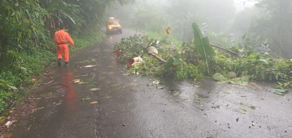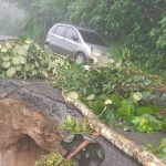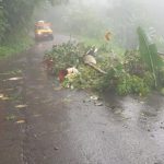 Estrada da Pedra Branca: interditada na altura da estação de tratamento de água. Aguardando chegada de caminhão que está preso no trecho bloqueado da Rio Santos para desenergizar rede e retirar árvore. Trecho com risco de curto na rede. Em razão disso, a Defesa Civil pede que ninguém passe pelo local até a remoção da árvore.